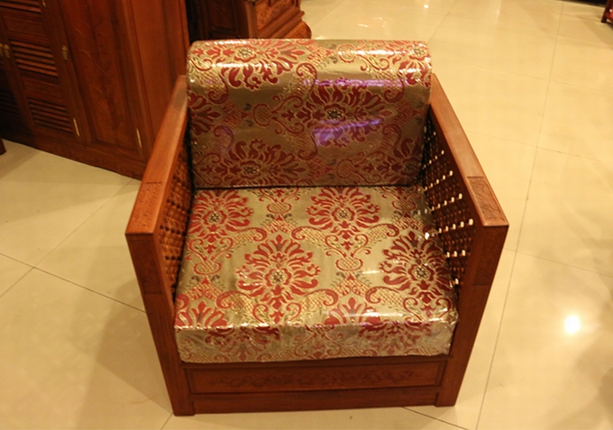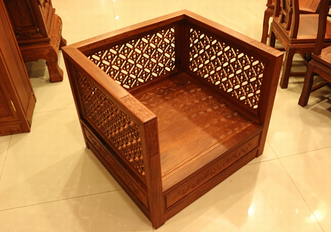 單人座沙發(fā)外觀方正匡整,兩邊扶手的高度設(shè)計(jì)的與靠背同高,而在其內(nèi)外兩側(cè)均雕繪有幅闌的鏤空幾何紋飾作為點(diǎn)綴,彰顯著浮美淡雅的中國(guó)風(fēng)式含蓄美。在沙發(fā)實(shí)際使用時(shí),配上軟墊之后的坐感也更覺(jué)舒適,沙發(fā)座腳處地設(shè)計(jì)顯得地較為獨(dú)特,也可以說(shuō)它已經(jīng)將座腳處設(shè)計(jì)的概念完全融入了沙發(fā)整體,以之整體式的箱體結(jié)構(gòu)作為座腳,更覺(jué)敦實(shí)、小巧玲瓏,頗有些許歐派家具式風(fēng)格的韻味,實(shí)為別致。