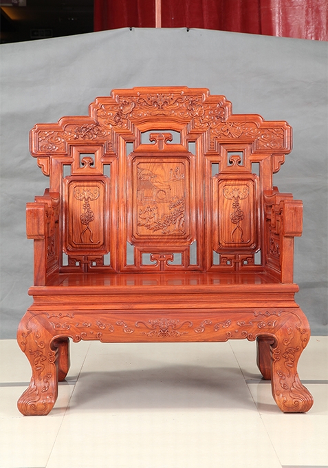 最后,來說說背靠板最上端部分的那綿延浮縷、緊密嚴挨著的充斥于其間的祥云云海紋飾。該處圖案可以說是整體沙發圖案中最為驚艷也是最為惹眼的一處了,在這其中也還另在正中位置處雕繪有寄寓幸福之意的蝙蝠紋;以及下方銜掛有的“磬”紋(磬——它是中國古代宮廷的打擊樂器,形有大有小,上方刻有花紋,并鉆孔懸掛于架下,用以擊打傳聲,其聲響通透清亮極為悅耳);左右兩側板面另還雕飾有幾處寄寓福壽平安之意的道八寶紋飾,從左往右分別是魚骨、羽扇、寶葫以及玉板四處。整處圖案雕飾于呈階梯式層層遞進延伸之外輪廓,銜駕于最上端背板之上,在呈現美好寄寓的同時也同樣有著寶座威嚴、尊貴之氣勢,也更適合擺放在平常家中使用。